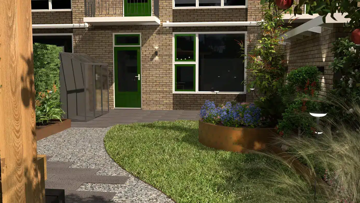 Dit ontwerp is uitgewerkt als realistische 3D-visualisatie, zodat materialen, indeling en functies vooraf duidelijk zichtbaar zijn. Zo ontstaat een tuinontwerp dat volledig aansluit bij de wensen van de bewoners.