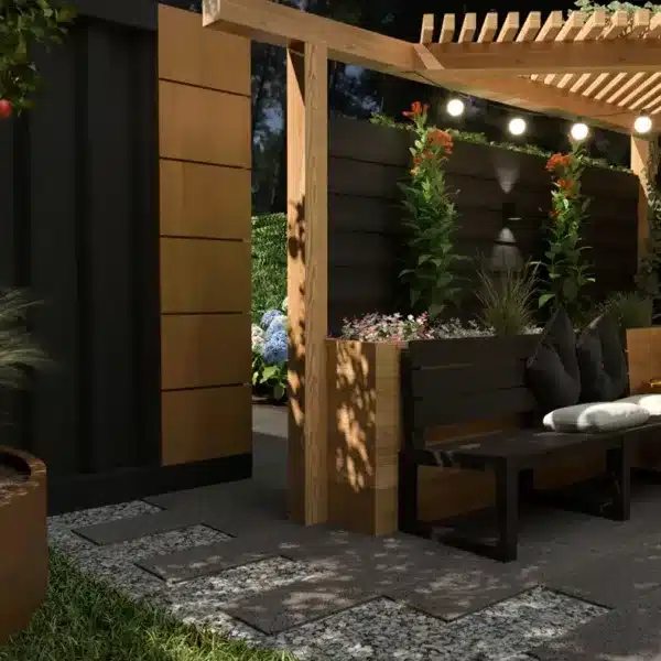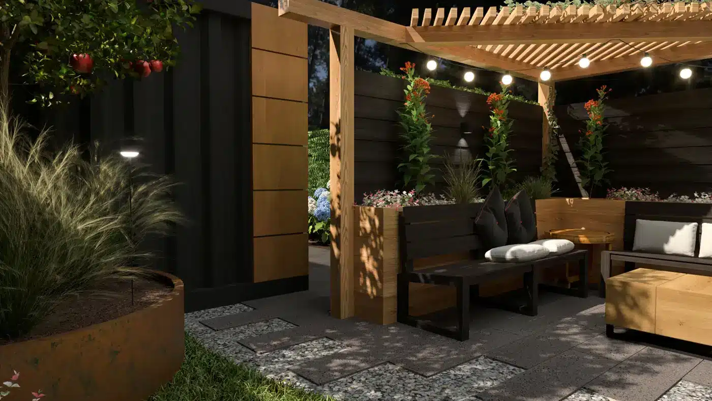 Dit moderne tuinontwerp is ontworpen als een veelzijdige buitenruimte waarin ontspannen, werken en groen samenkomen. Strakke lijnen, warme materialen en sfeervolle verlichting zorgen voor een tuin die zowel overdag als in de avond prettig aanvoelt.