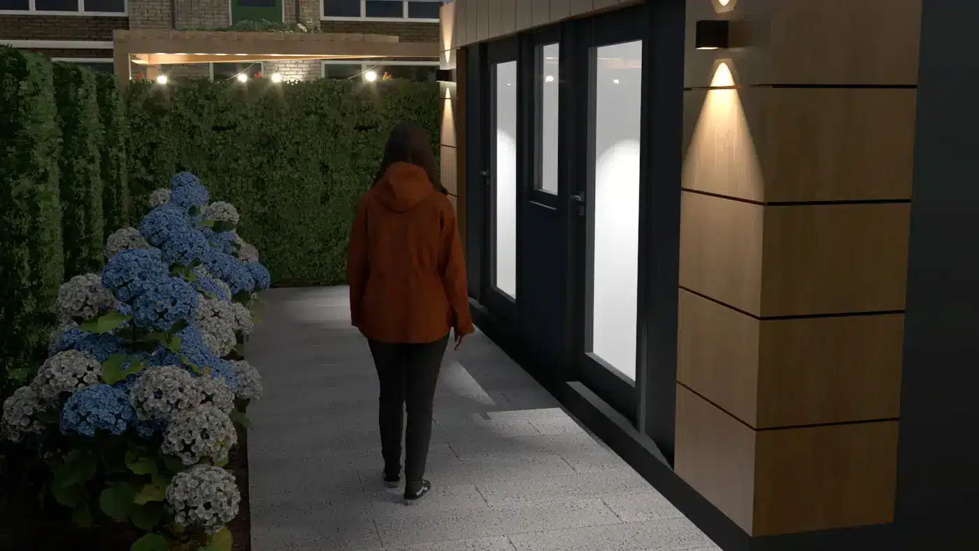 Wandverlichting langs de gevel, spots in de beplanting en verlichting bij de pergola zorgen voor veilige looproutes en een aangename sfeer in de avond. Zo blijft de tuin op elk moment van de dag bruikbaar.